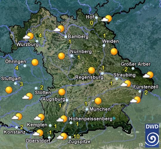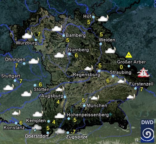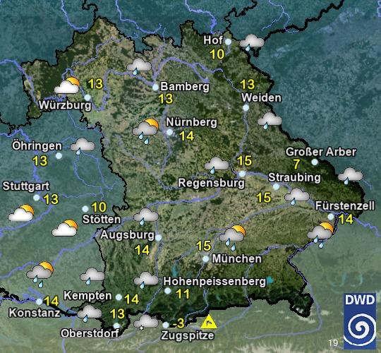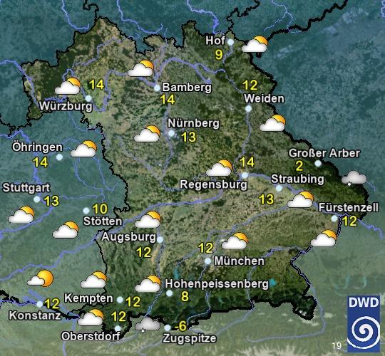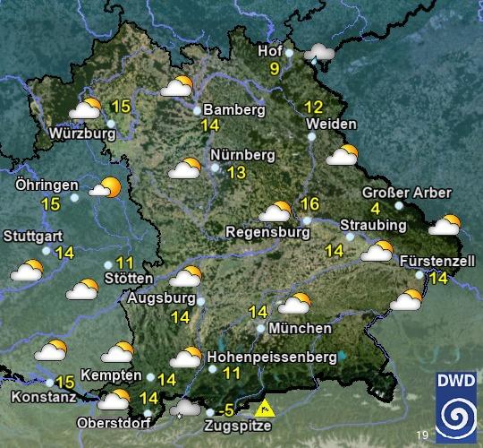 Am Montag wechselnd bewölkt, zeitweise Sonne. Vielerorts niederschlagsfrei, an den Alpen und im Vorland im Tagesverlauf einzelne Schauer, in Hochfranken gegen Abend etwas Regen. Höchstwerte zwischen 9 und 17 °C. Mäßiger, zeitweise auffrischender Wind aus Nordwest bis Nord.